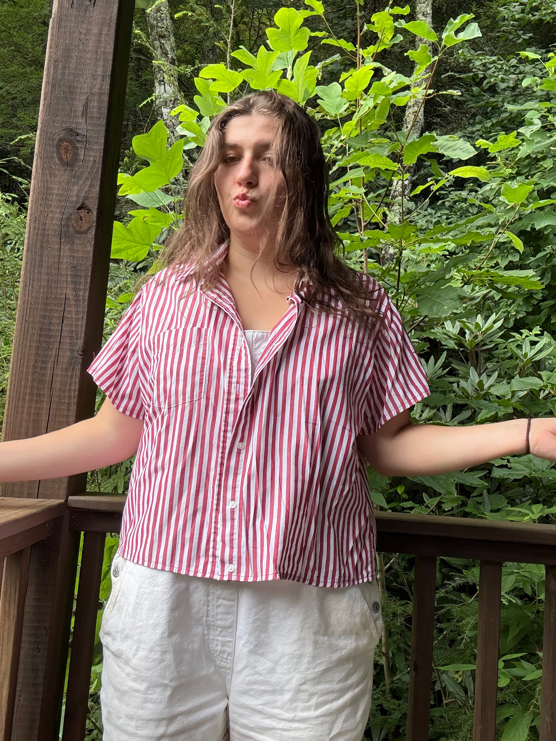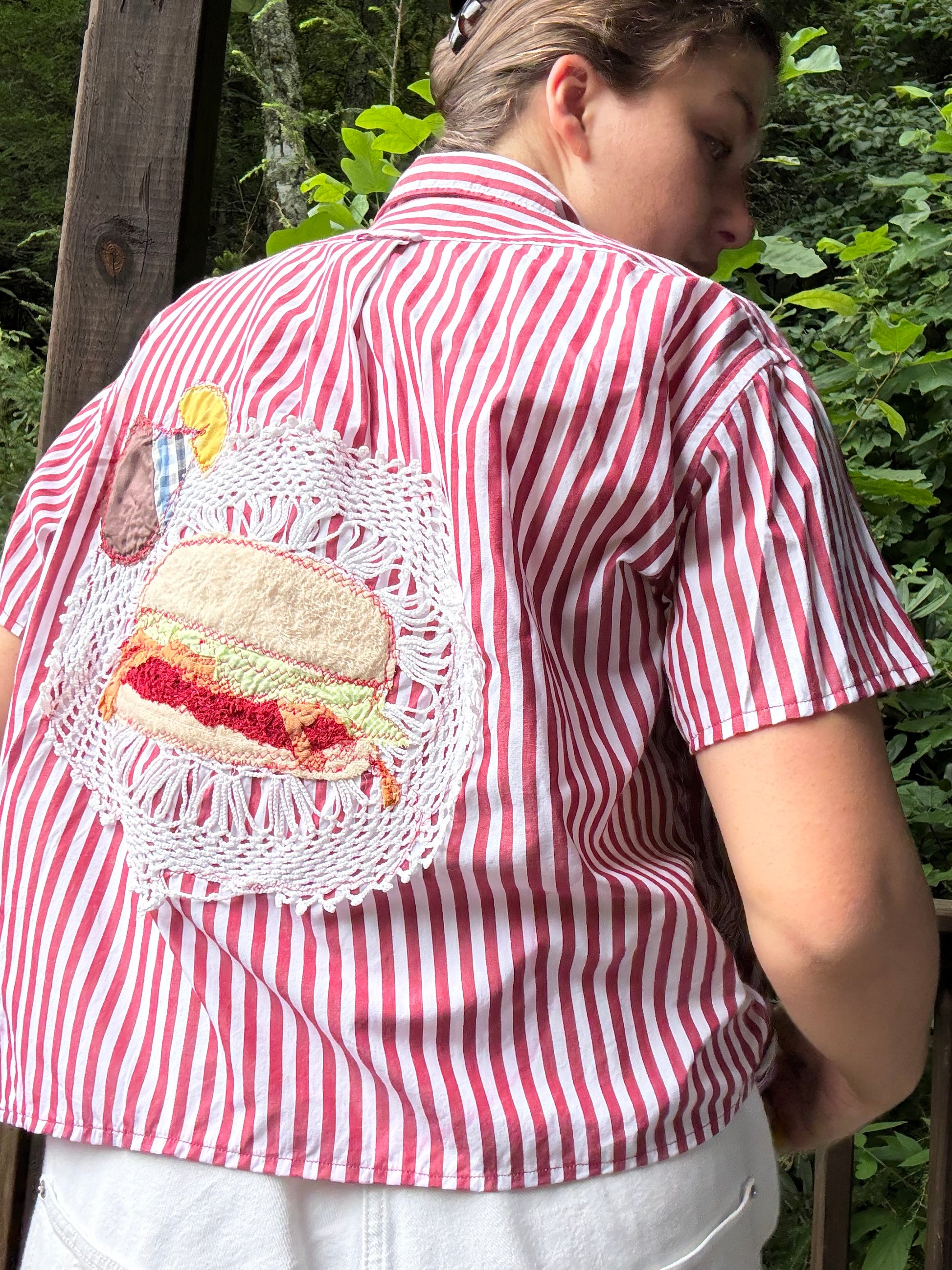 take your food with you on the GO!! is it a burger? a sloppy joe? you decide!!! complete with a boxy crop. Upcycled Bowen & Wright button up. Labeled size 17.5 (in real people terms.. Size Large) red and white stripe shirt of your dreams. stripes never go out of style!!!